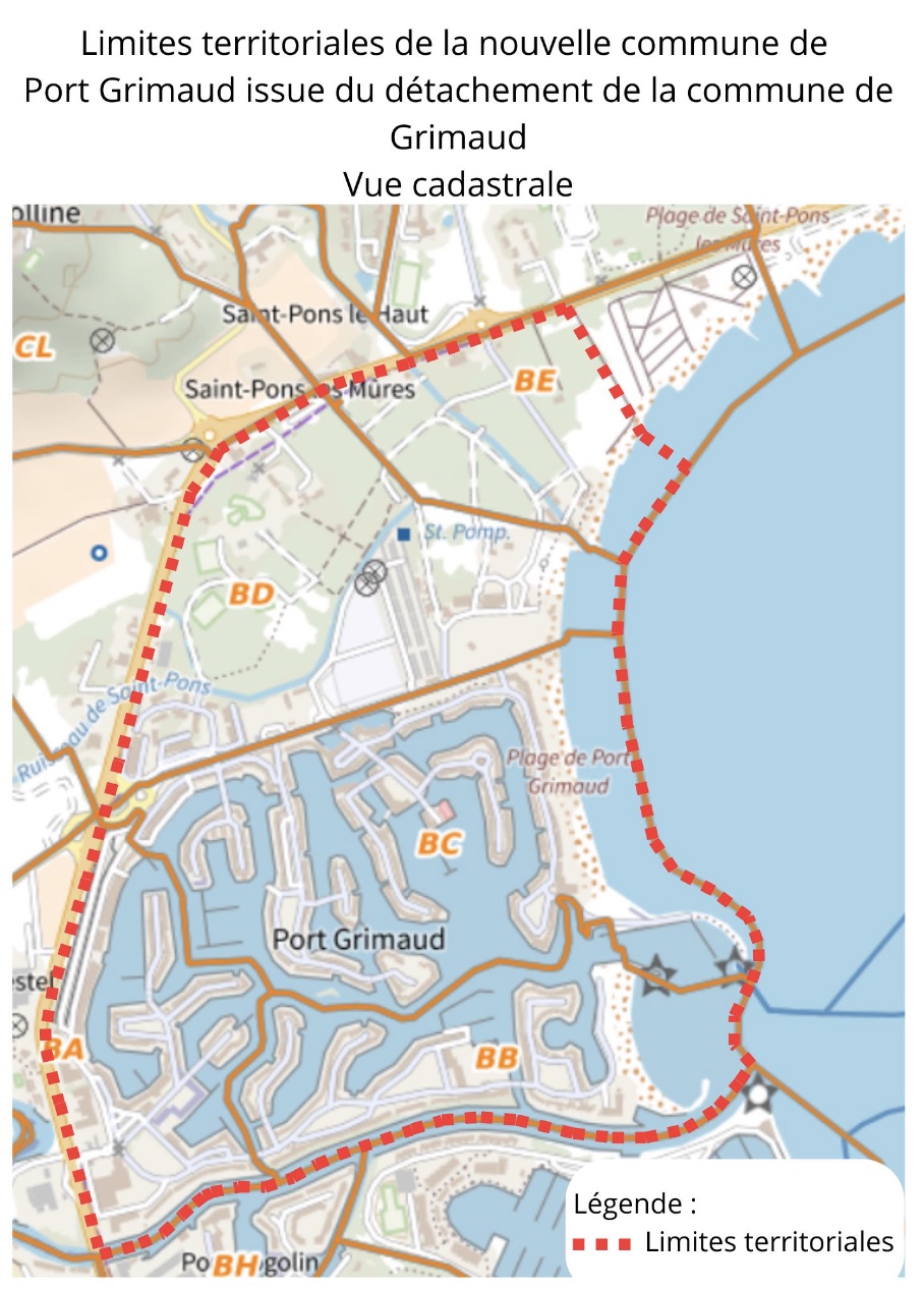 Les limites territoriales de la nouvelle commune de Port Grimaud issue du détachement de la commune historique de Grimaud sont donc les suivantes :