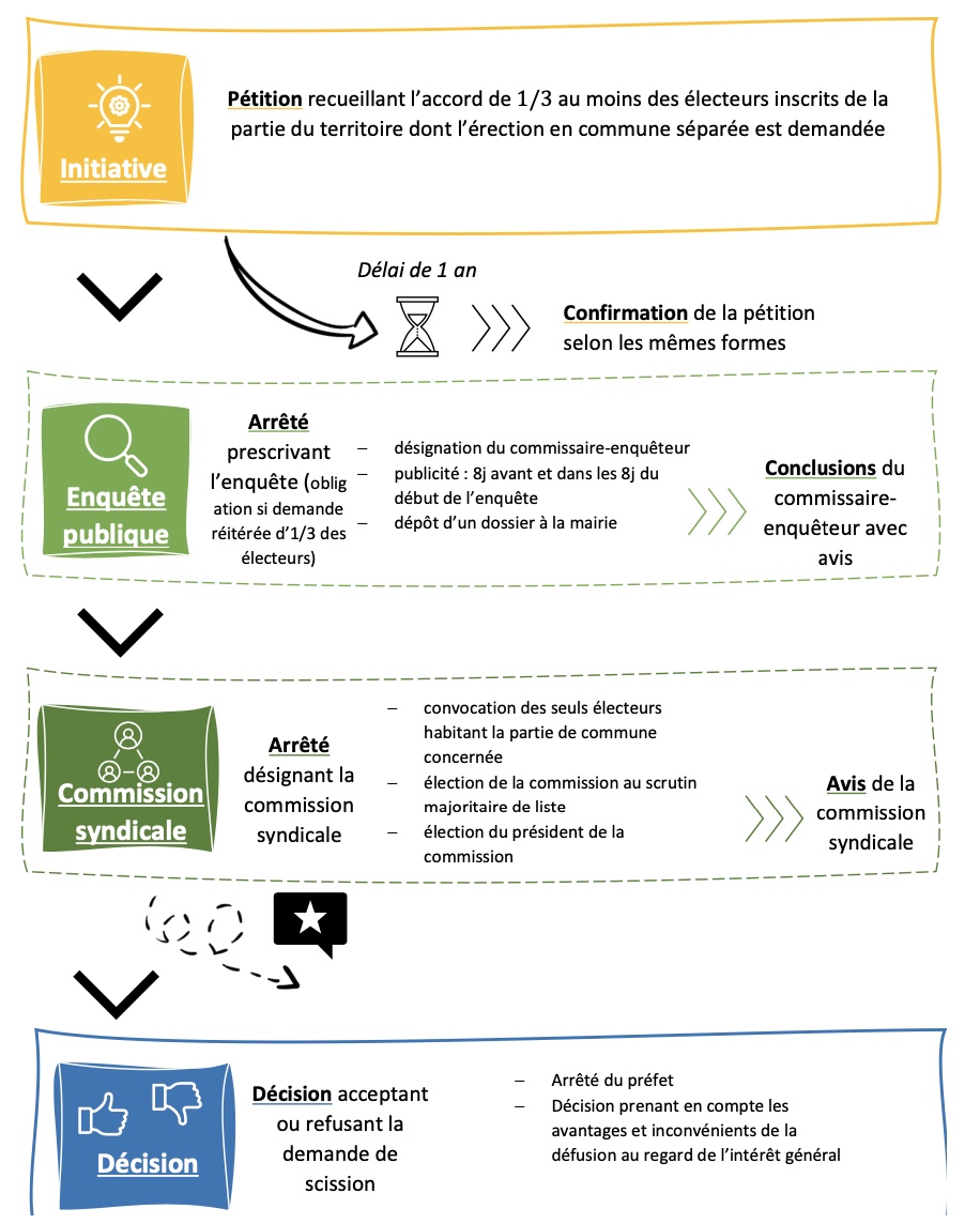 - Une pétition signée par au moins un tiers des électeurs inscrits sur les listes électorales de la commune ou de la portion de territoire à détacher. Cette pétition doit être confirmée après un délai d’un an pour être recevable.